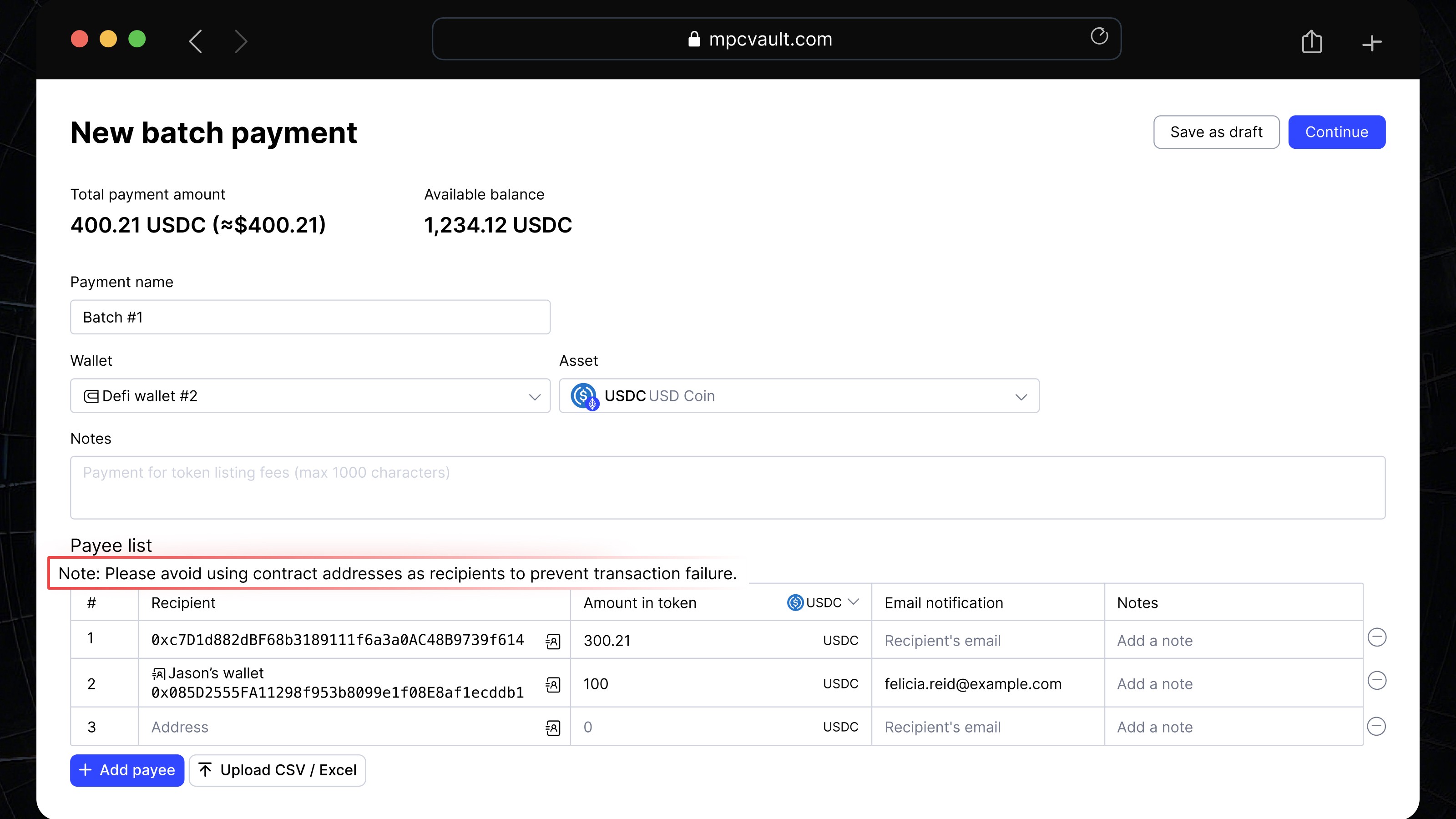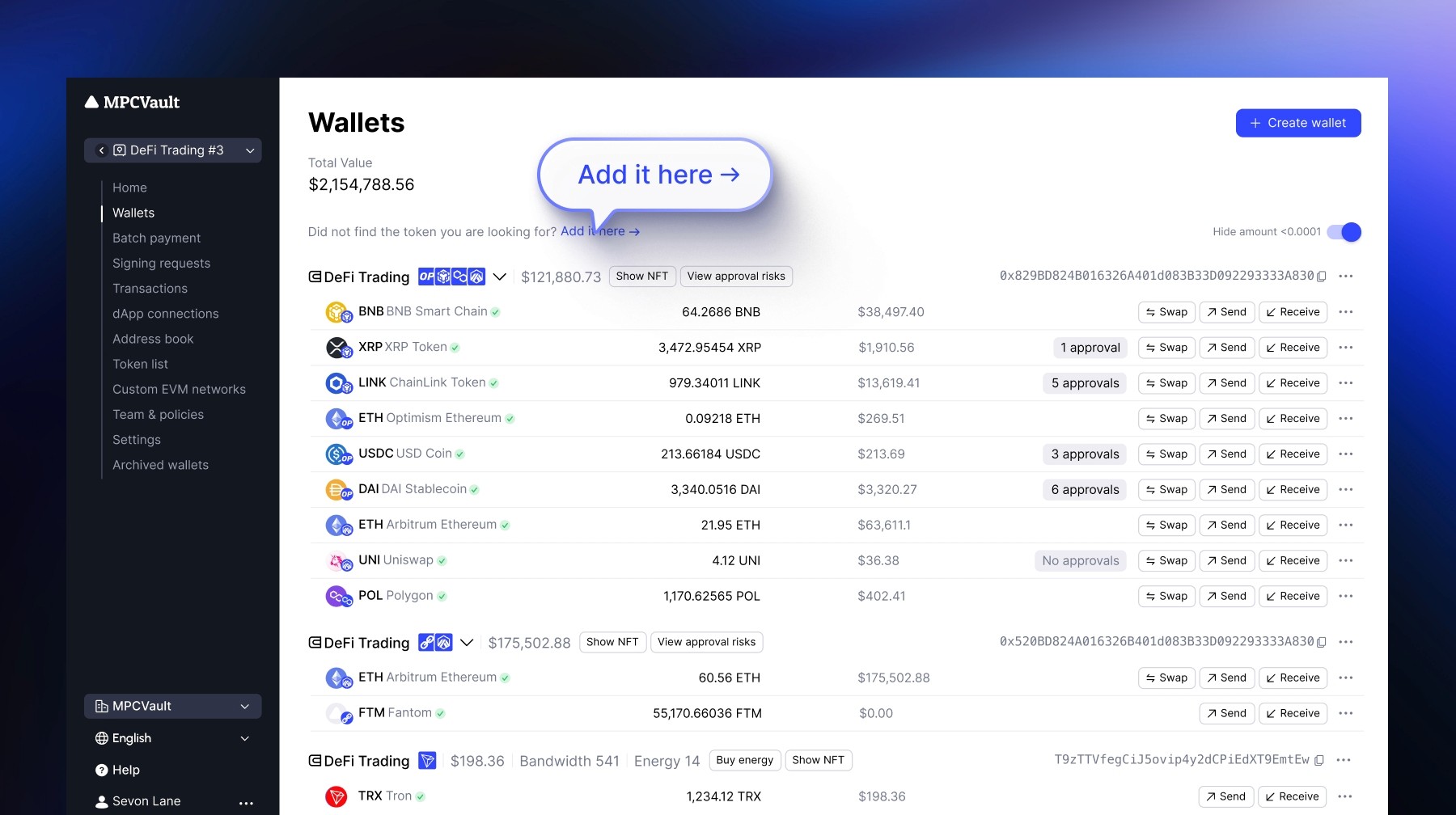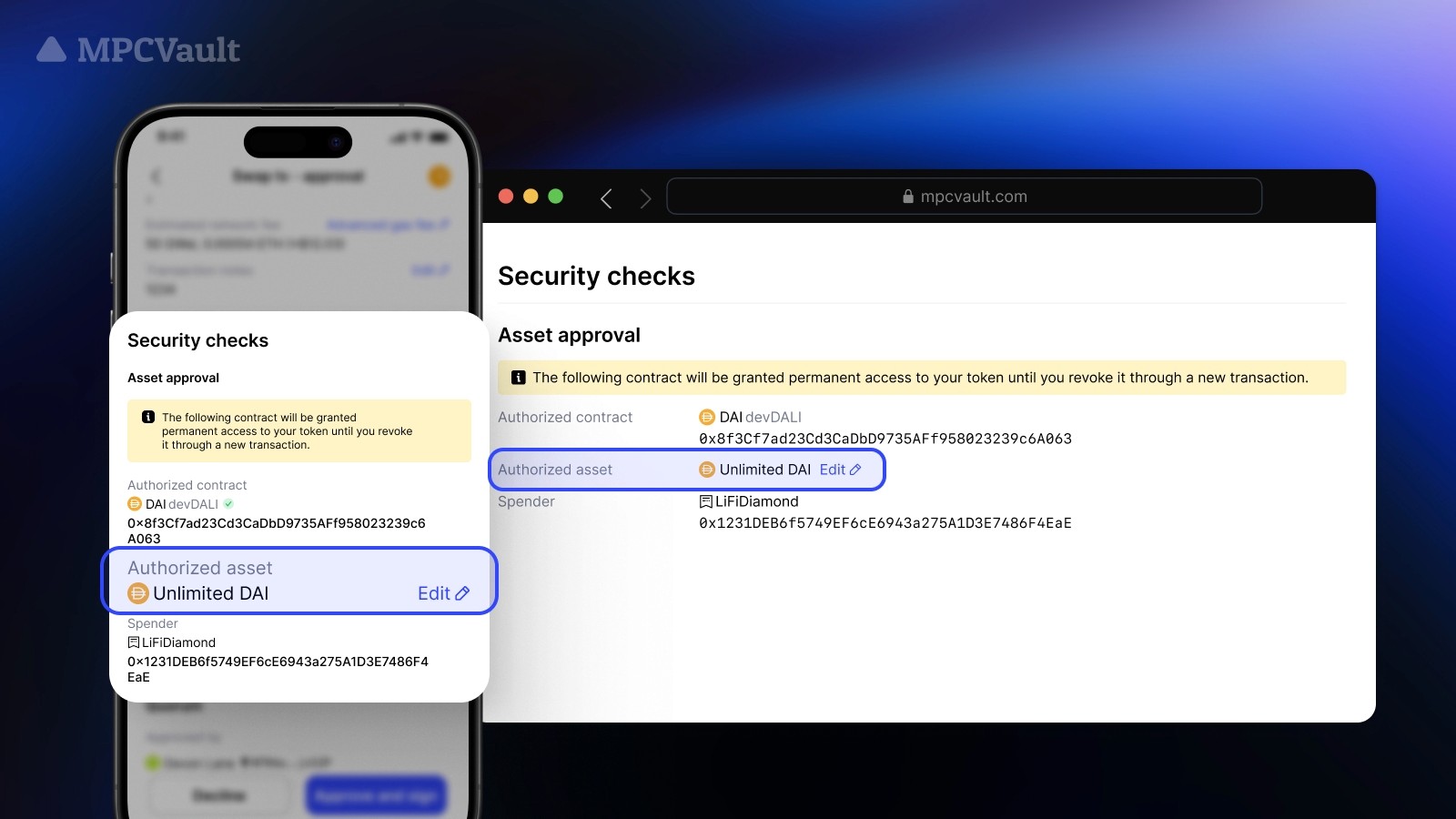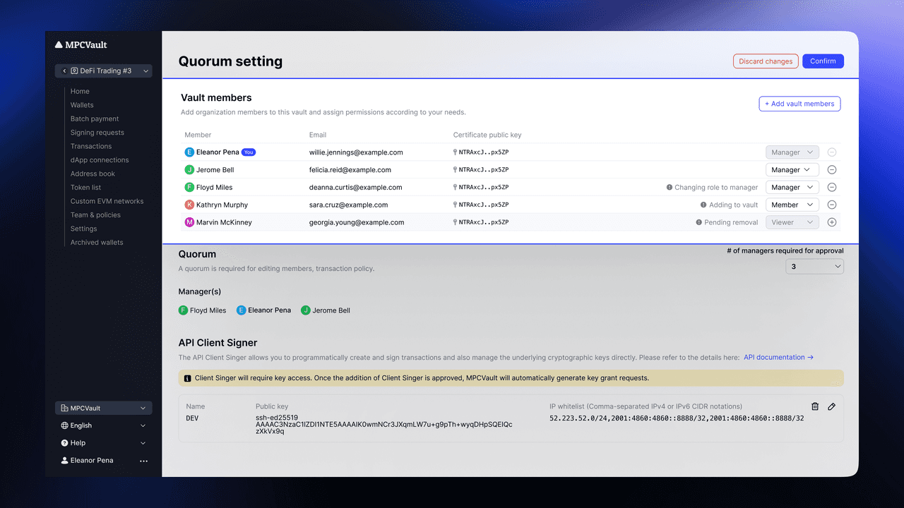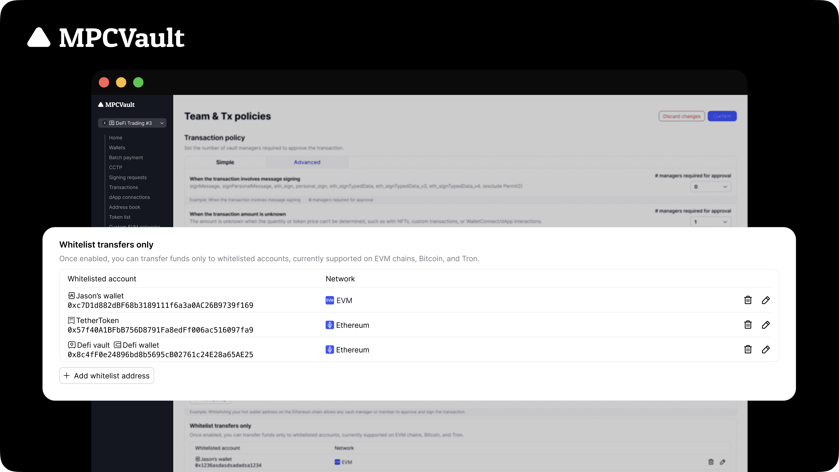 MPCVault is a non-custodial cryptocurrency wallet designed for team usage. By using our services, you acknowledge and agree that you are solely responsible for the management and security of your team's private keys, passwords, and any other sensitive information required to access and control your wallet and its associated funds. Cryptocurrency investments and transactions are subject to various risks, including price volatility, regulatory changes, and dApp vulnerabilities. By using MPCVault, you acknowledge and accept these risks and agree that MPCVault is not liable for any financial losses, damages, or consequences that may result from your use of our services or your participation in cryptocurrency transactions. It is essential for users to take proper security precautions, including but not limited to creating secure passwords, backing up private keys, and following best practices for protecting sensitive information. MPCVault is not responsible for any damages, losses, or issues that may arise from user errors, negligence, or failure to follow security guidelines. MPCVault is not a financial advisor and does not provide investment advice or recommendations. Users are responsible for conducting their own research, consulting with professionals, and making informed decisions about their cryptocurrency investments and transactions.