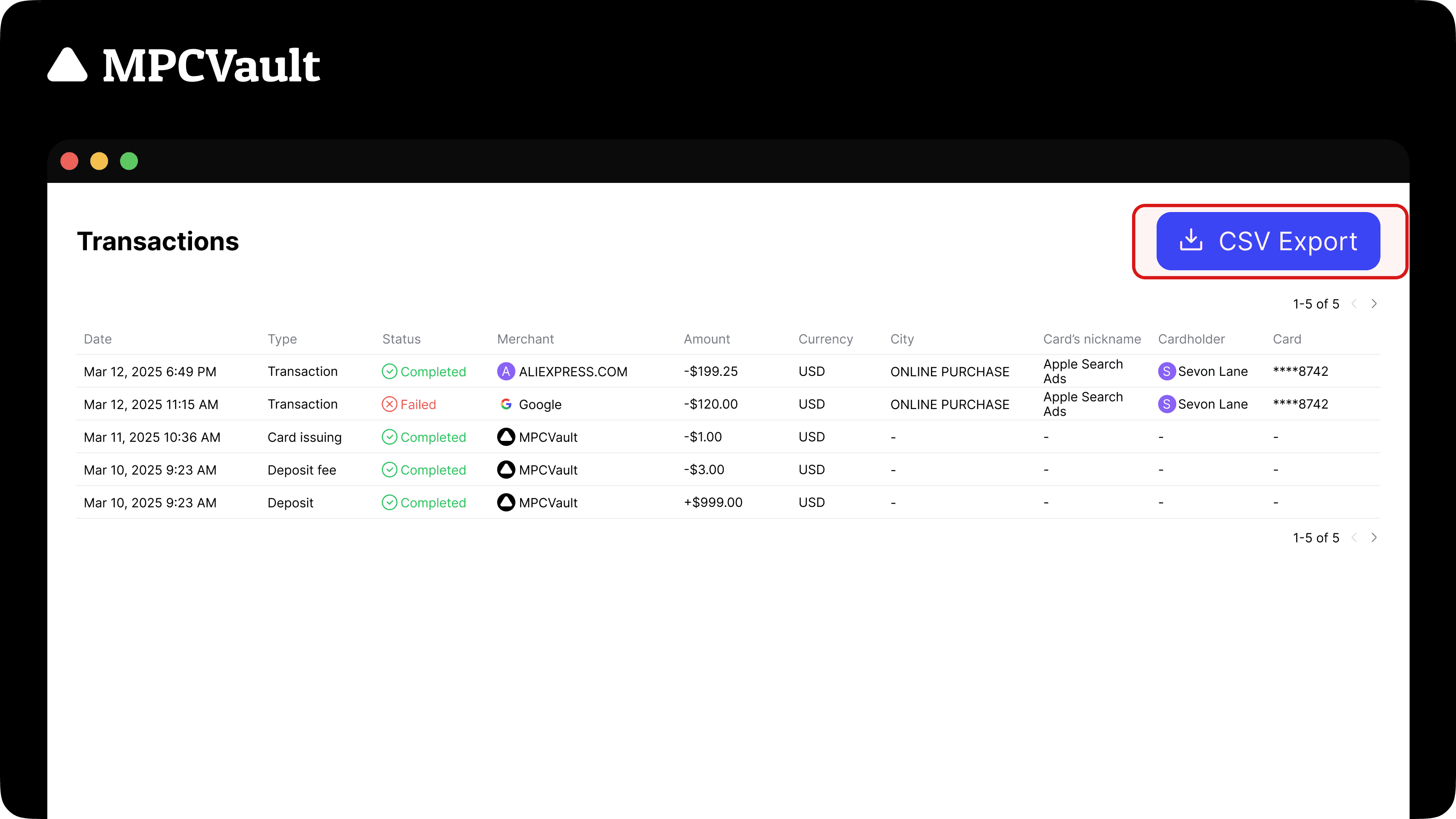 Download card transaction history via CSV