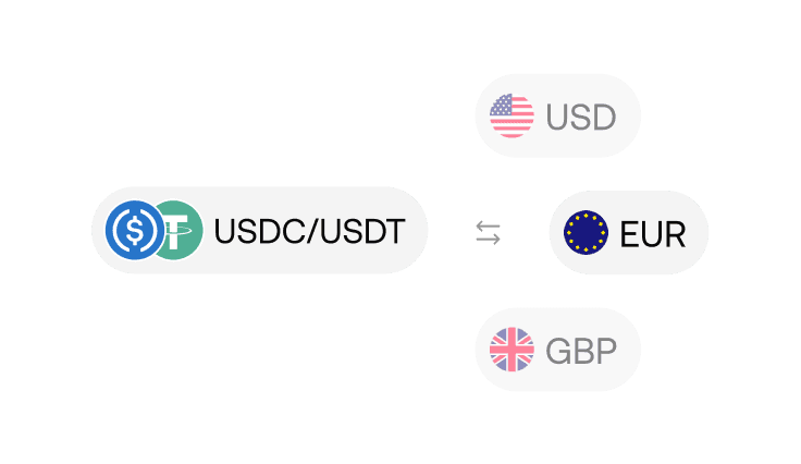 Instant off-ramping. Convert USDC/USDT to USD, EUR, or GBP and send directly to your verified business bank account.
