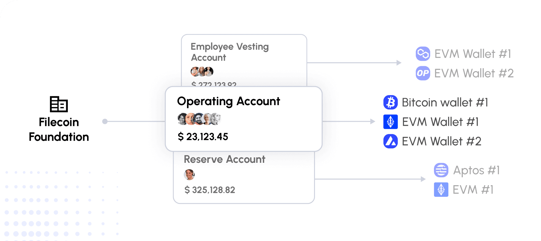 You can create multiple wallets for assets on various blockchains, set up members with hierarchical privileges, and establish approval flows based on volume.