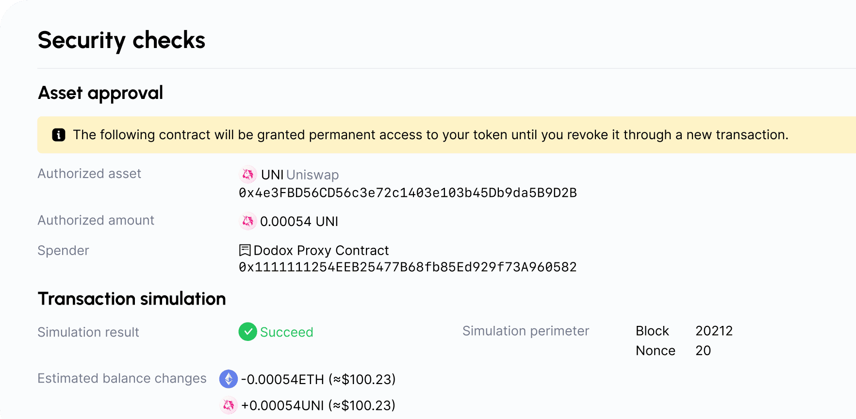 MPCVault simulates the transaction at the current block and shows you the calculated balance change of your account as if you have signed the transaction and had it included in the blockchain. This allows you to verify the outcome before confirming the transaction. Should the transaction lead to new token approvals, you will be alerted as well.