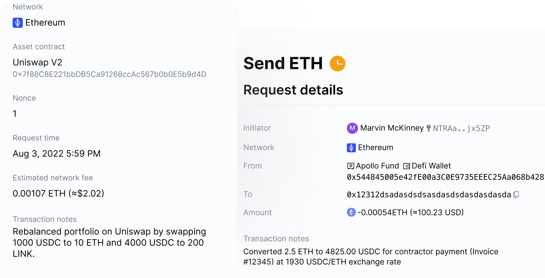 MPCVault checks your interaction address for any malicious signals and alerts you if it's a suspicious address. MPCVault pulls contract ABIs and decodes the content of the transaction for you. This way, you always know what you are signing and are protected from malicious contract interactions.