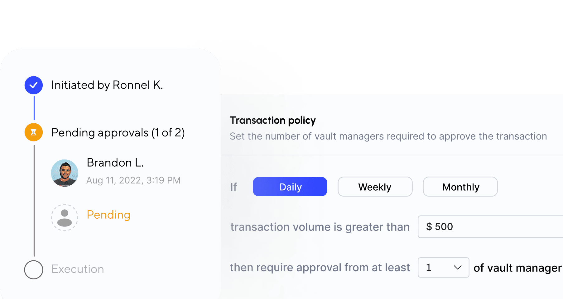 MPCVault's advanced policy engine allows you to utilize properties such as the total volume and destination addresses to determine the number of approvers required for each transaction.